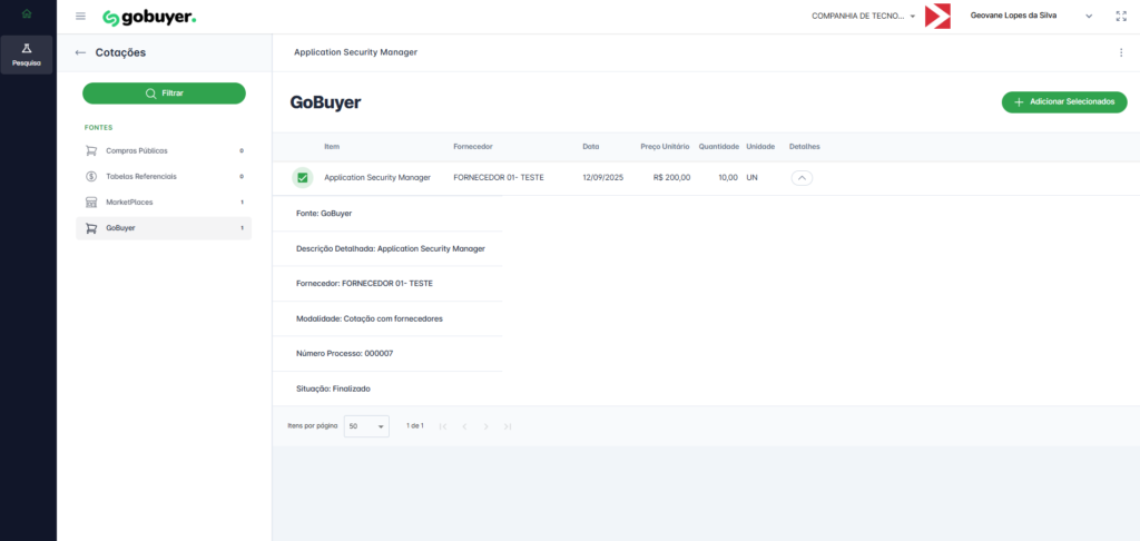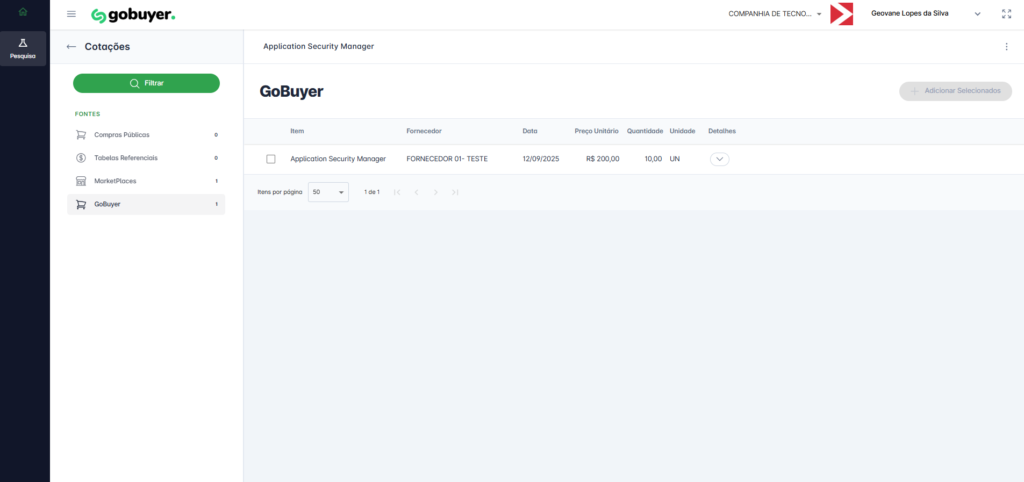 Após realizar a pesquisa, no filtro Gobuyer irá listar as cotações criadas na plataforma para o item desejado.